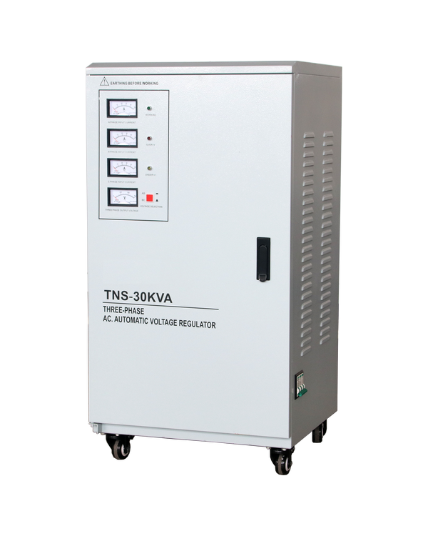 The TNS series is assembled from single-phase TND (SVC) series automatic voltage regulators, featuring independent phase-separated regulation for three phases, which ensures stable and safe voltage for each phase. The power input of the device adopts a three-phase four-wire system with star (Y) connection, and the output can be configured as either a three-phase four-wire system or a three-phase three-wire system. Three ammeters respectively display the output current of each phase, and a changeover switch is used in conjunction with a voltmeter to measure the output line voltage of each phase through gear shifting. Models with a rated capacity of 20 kVA and above are composed of three single-phase automatic voltage regulators of corresponding capacities, adopting an autotransformer design.